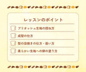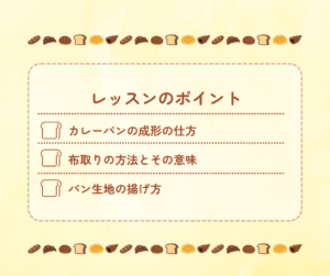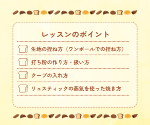 こうして毎回少しずつよりハイレベルのパン作りを実践いただくことで、技量のステップアップを実感いただけるレッスンとなっていますが、これらの技術を着実に身に着けていただくことで、今後のパン作りの幅が更に一層広がり、様々な種類のパンをご自宅でもお手軽に作って頂けるようになります。