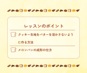 こちらのレッスンで作るメロンパンは、クッキー生地にココアを混ぜ合わせ、風味豊かなメロンパンに仕上げています。